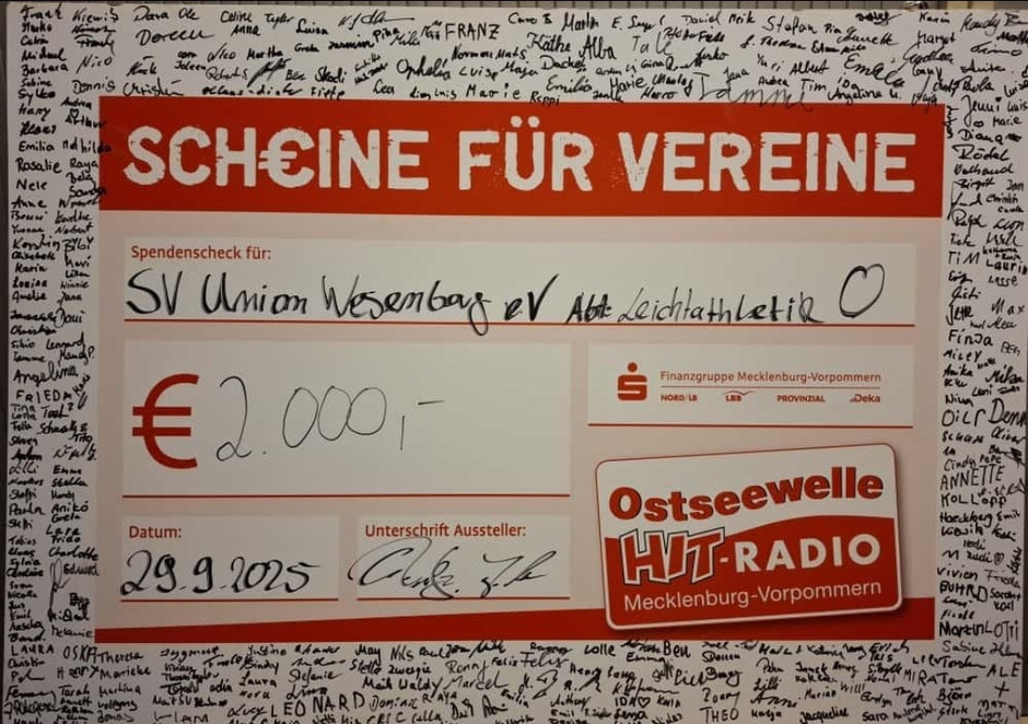 Ende September wurde Union Wesenberg im Rahmen der Aktion ‘SCH€INE für Vereine’ von Ostseewelle HIT-RADIO Mecklenburg-Vorpommern ausgewählt und hatte damit bereits 1000 € sicher. Am Nachmittag gab es dann die Chance, diese Gewinnsumme mit genügend Unterstützern noch auf 2000 € zu verdoppeln